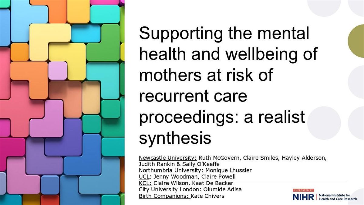 Professor Ruth McGovern invites you to join researchers from Newcastle University and partners, to a half-day, in-person event. At the event we will share findings from a recent evidence synthesis examining how best to support the mental health and wellbeing of mothers at risk of recurrent care proceedings and, where it is safe to do so, prevent their children entering care. We will present key insights from research, including what works, for whom, in what contexts and why. Attendees will participate in discussion about the implications of these findings for practice and agree actionable recommendations for the local and national health and social care system. The event will be followed by networking over lunch (provided).