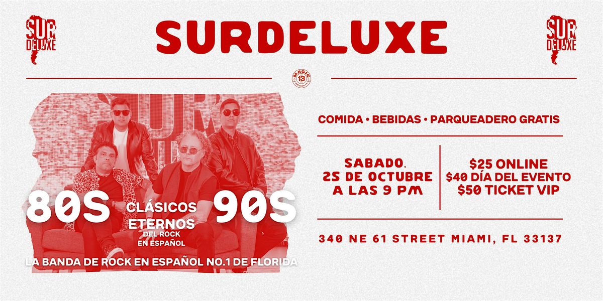 🌙 Sur Deluxe en vivo – Rock en español 80s y 90sLos himnos que marcaron una época regresan este 25 de octubre en Magic 13 Brewing con Sur Deluxe, la banda de rock en español #1 de Florida. Revive las canciones que hicieron historia en una noche inolvidable.