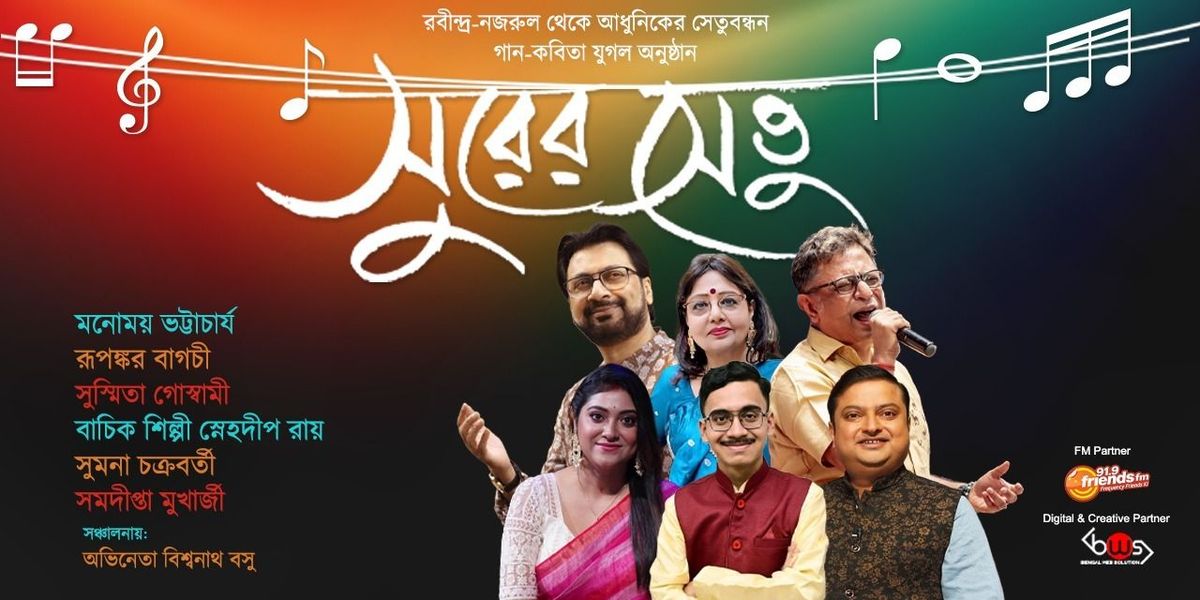 A bridge of melodies and emotions, Surer Setu is a soulful cultural evening that connects the timeless legacy of Rabindranath Tagore and Kazi Nazrul Islam with contemporary Bengali music and poetry. Curated as a seamless journey of songs and recitations, the programme celebrates the continuity of Bengali cultural expression across generations.