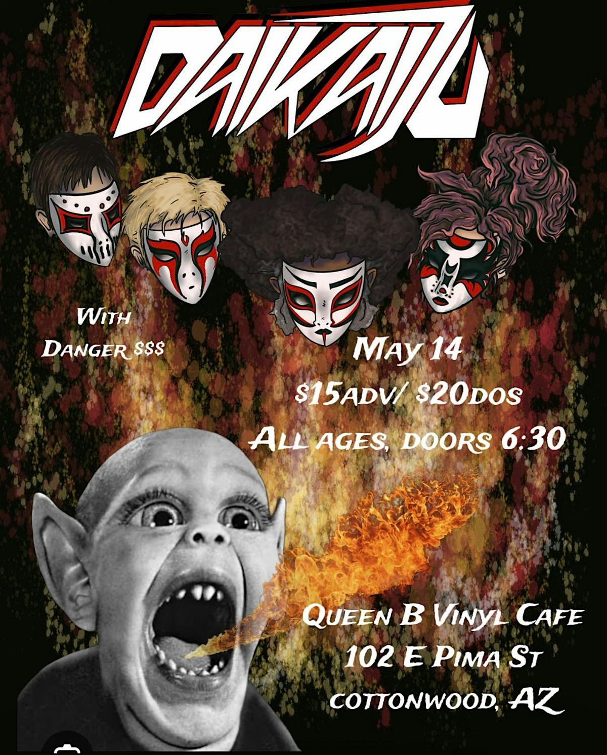 Daikaiju rides the wave back to the Queen B sandy shores! The psychobilly kaiju craze returns to light the fires of Cottonwood once more, joined by desert psych rock Danger $$$! Prepare for an attack of insane riffs this May! COTTONWOOD-GO!