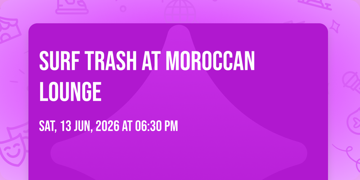 ✨ Enter a world of endless possibilities at Surf Trash at Moroccan Lounge, where every moment tells a story! 🏛️ The stunning Moroccan Lounge in vibrant Los Angeles, CA transforms into a realm of wonder on June 13th, 2026 at 06:30 PM. 🌟 They have crafted an experience that goes beyond the ordinary, combining elements of surprise, delight, and pure entertainment. Every detail has been thoughtfully considered to ensure your journey with us is nothing short of extraordinary. 🎯 Join fellow adventure seekers and memory makers in this celebration of imagination and innovation. 🎊 Reserve your spot today and be part of something truly special!
