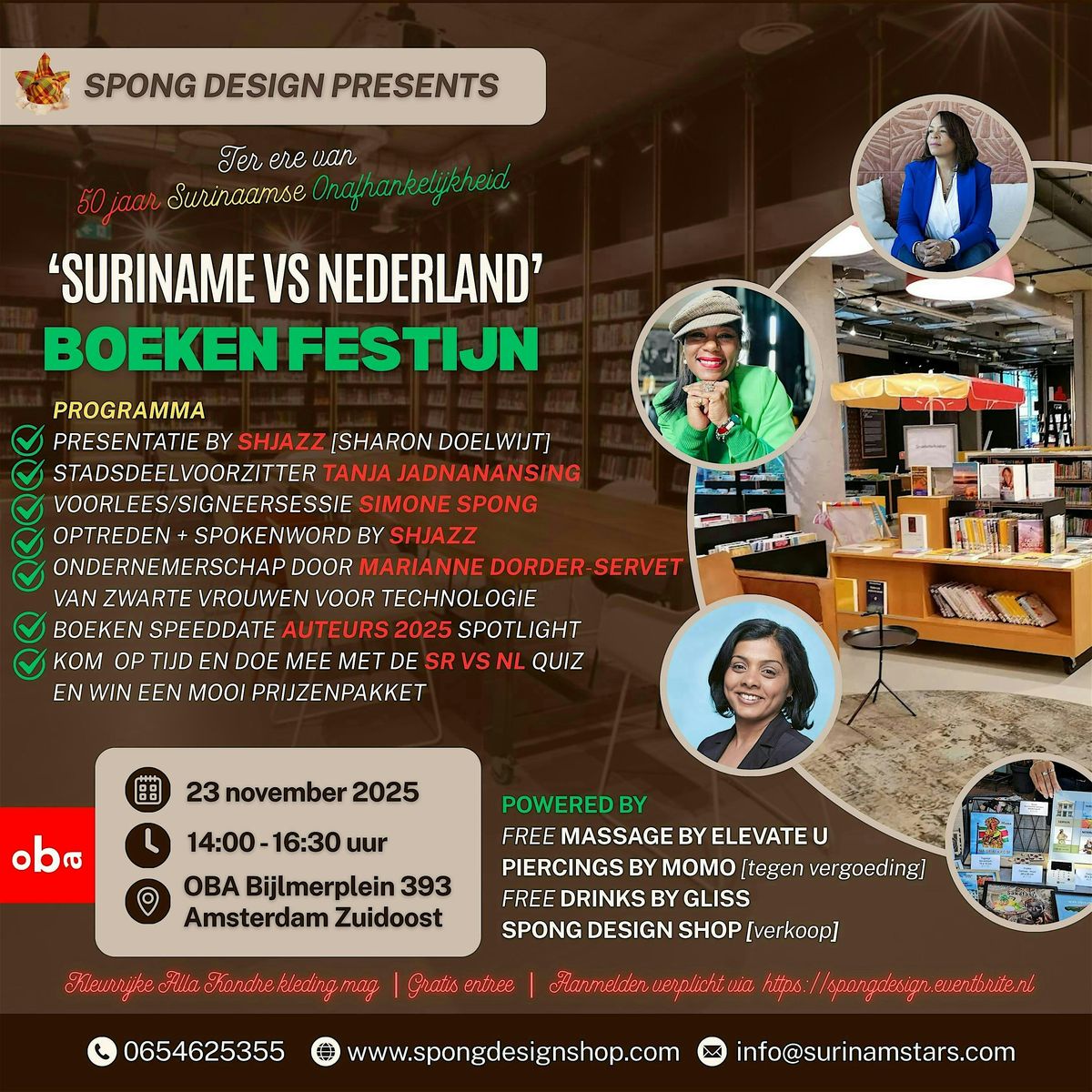 Spong Design organiseert ter ere van 50 jaar Surinaamse Onafhankelijkheid: 'Suriname versus Nederland' Boek Festijn. Presentatie by SHJAZZ [Sharon Doelwijt]. Uitreiking Stadsdeelvoorzitter Tanja Jadnanansing. Voorlees/Signeersessie Simone Spong. Optreden + Spokenword by SHJAZZ. Ondernemerschap door Marianne Dorder-Servet. Boeken speeddate: Collega Auteurs 2025 in the Spotlight! Doe mee met de SR vs NL quiz en win een pakket! Kom op tijd, inloop 13:30 uur. Start programma direct om 14:00 uur.