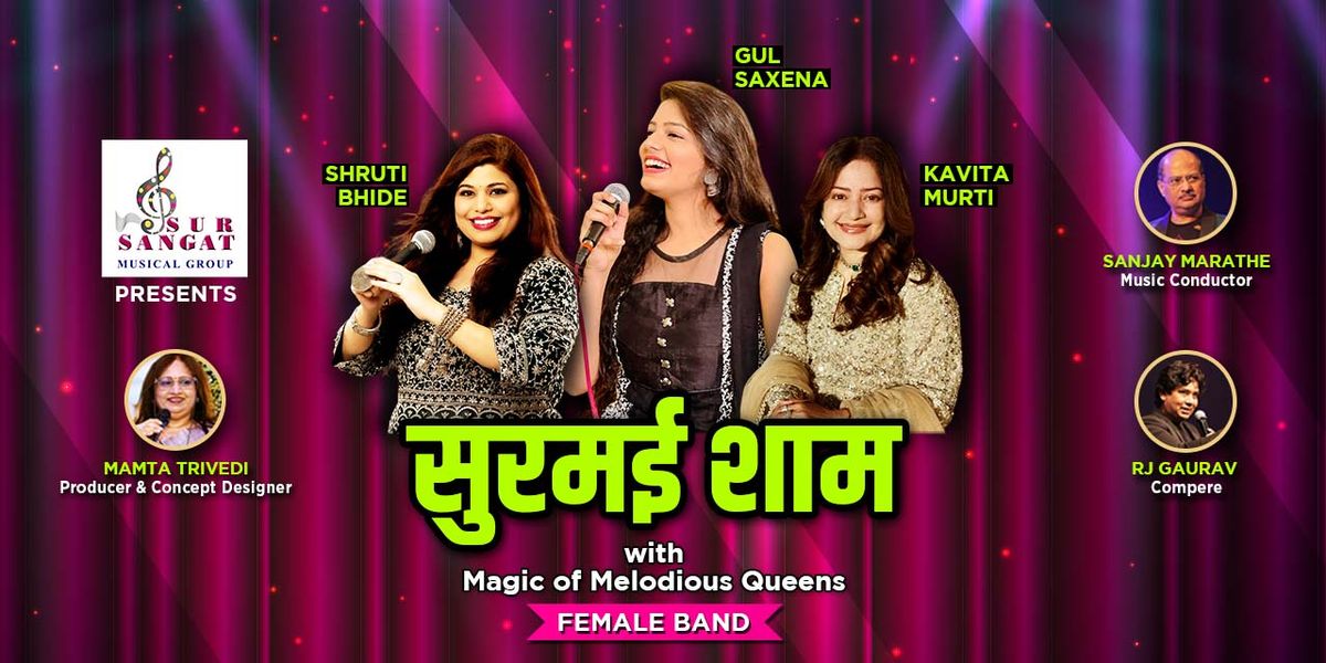 This upcoming event, “सुरमई शाम,” features the Magic of Melodious Queens (a female band). The evening will include performances by Shruti Bhide, Gul Saxena, and Kavita Murti, with musical arrangements by Sanjay Marathe. RJ Gaurav will host the event.