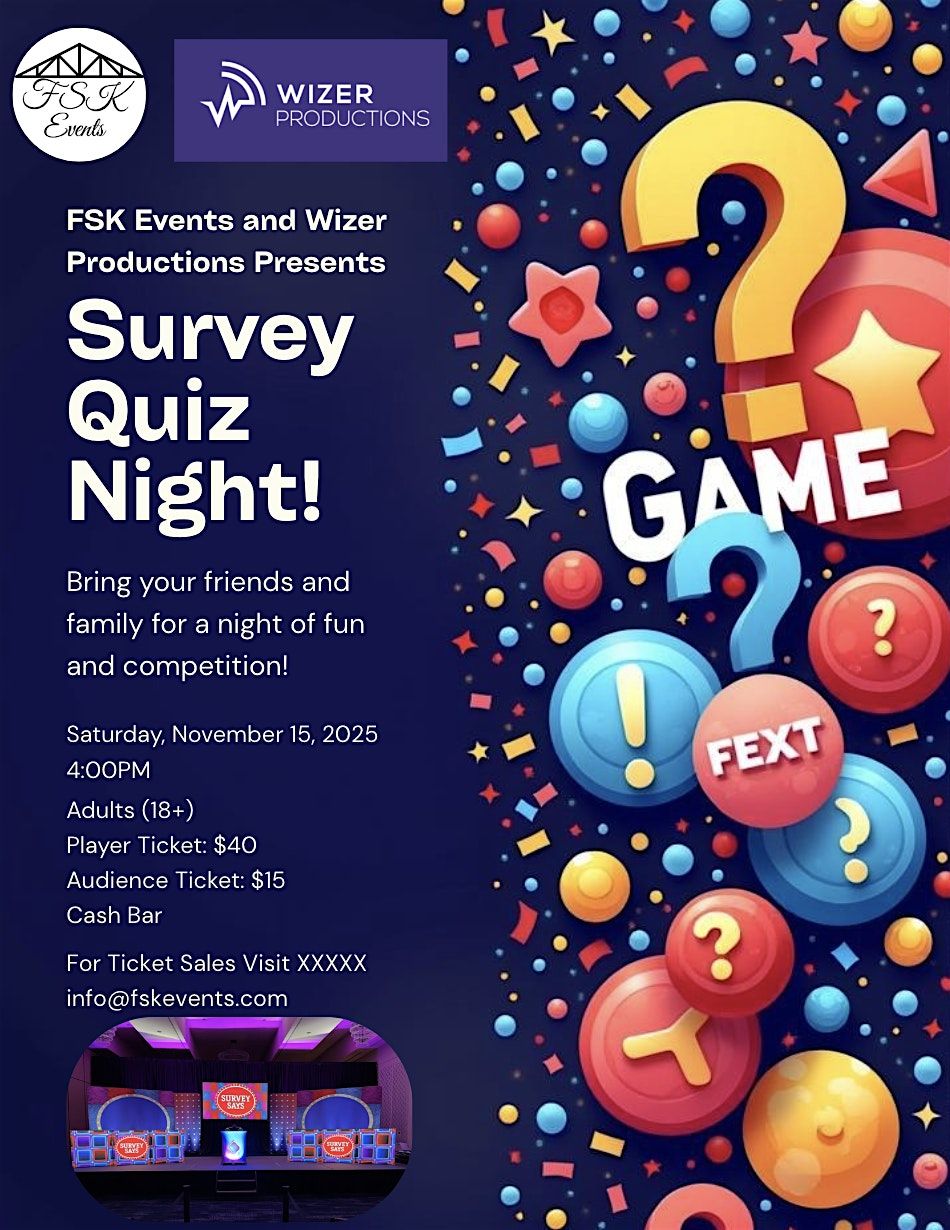 Get ready to test your survey smarts at Survey Quest, the ultimate game-show-style event hosted by FSK Events! Gather your friends, family, or coworkers for a night of fun, laughter, and friendly competition. Grab your tickets now and see if your team has what it takes to come out on top!