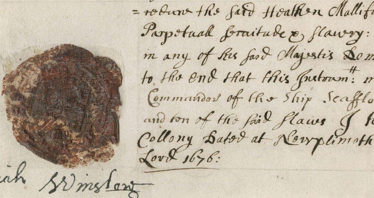 Image: A close-up of a certificate from Plymouth colony governor Josiah Winslow granting Captain Thomas Smith of the Seaflower the right to transport 110 Native men, women, and children out of Plymouth and to sell them into "perpetuall servitude & slavery." Dated August 9, 1676. Certificate to Thomas Smith, 9 August 1676, Josiah Winslow, 1676. Collections of the Massachusetts Historical Society, Boston
