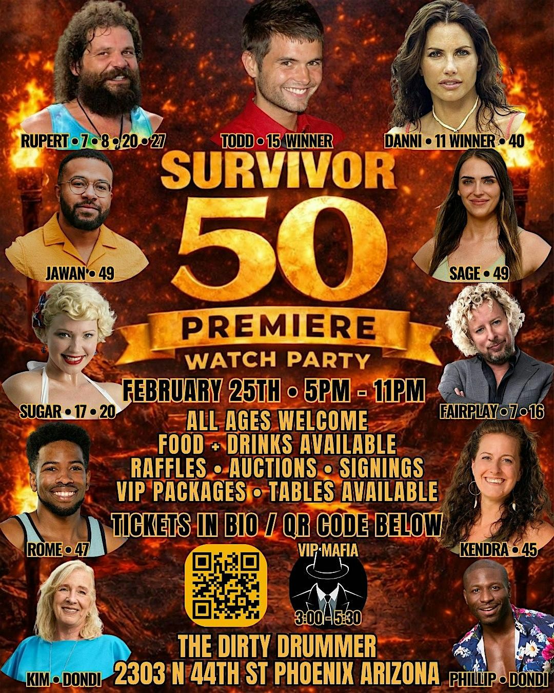 Welcome to the Survivor 50 Premiere Phoenix Arizona Watch Party! Join us on February 25, 2026 for an exciting evening watching the 3 hour premiere filled with twists, challenges, and drama.