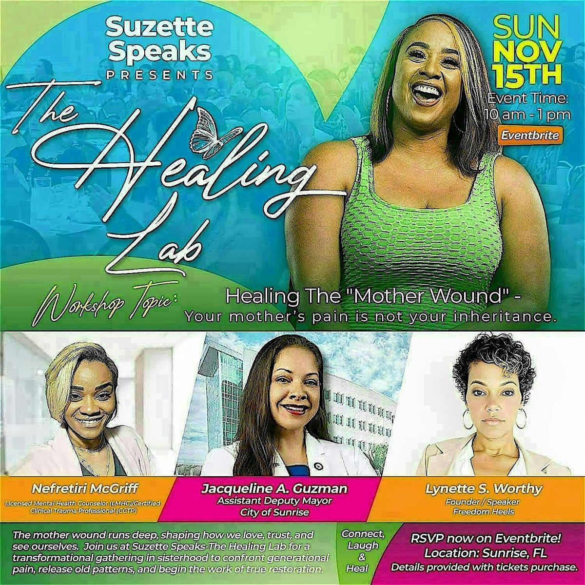 Join us at ✨ Suzette Speaks presents: “The Healing Lab” – a transformative workshop for women!🍇✨ Hear from inspiring speakers, as we come together to overcome difficult times and bounce back even stronger. In this edition of “The Healing Lab” —our topic of discussion is designed for women who are experiencing a "mother wound" and whose relationship with their mother's left mental, emotional, and spiritual scars they are continuing to process. The mother wound runs deeper than we often admit—but so does our power to heal. Save your seat for this transformational Healing Lab!
