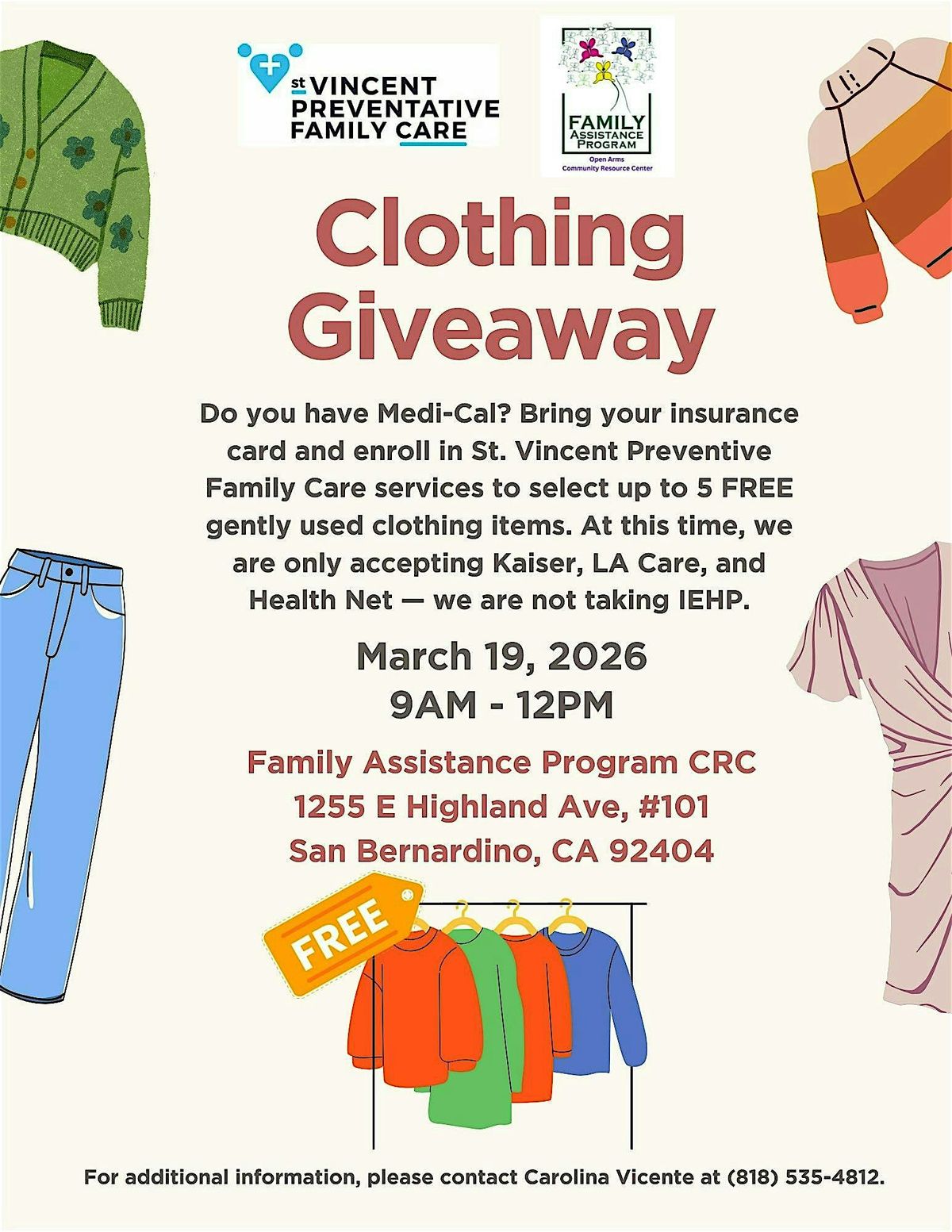 Do you have Medi-Cal? Bring your insurance card and enroll in St. Vincent Preventive Family Care services to select up to 5 FREE gently used clothing items. At this time, we are only accepting Kaiser, LA Care, and Health Net — we are not taking IEHP.