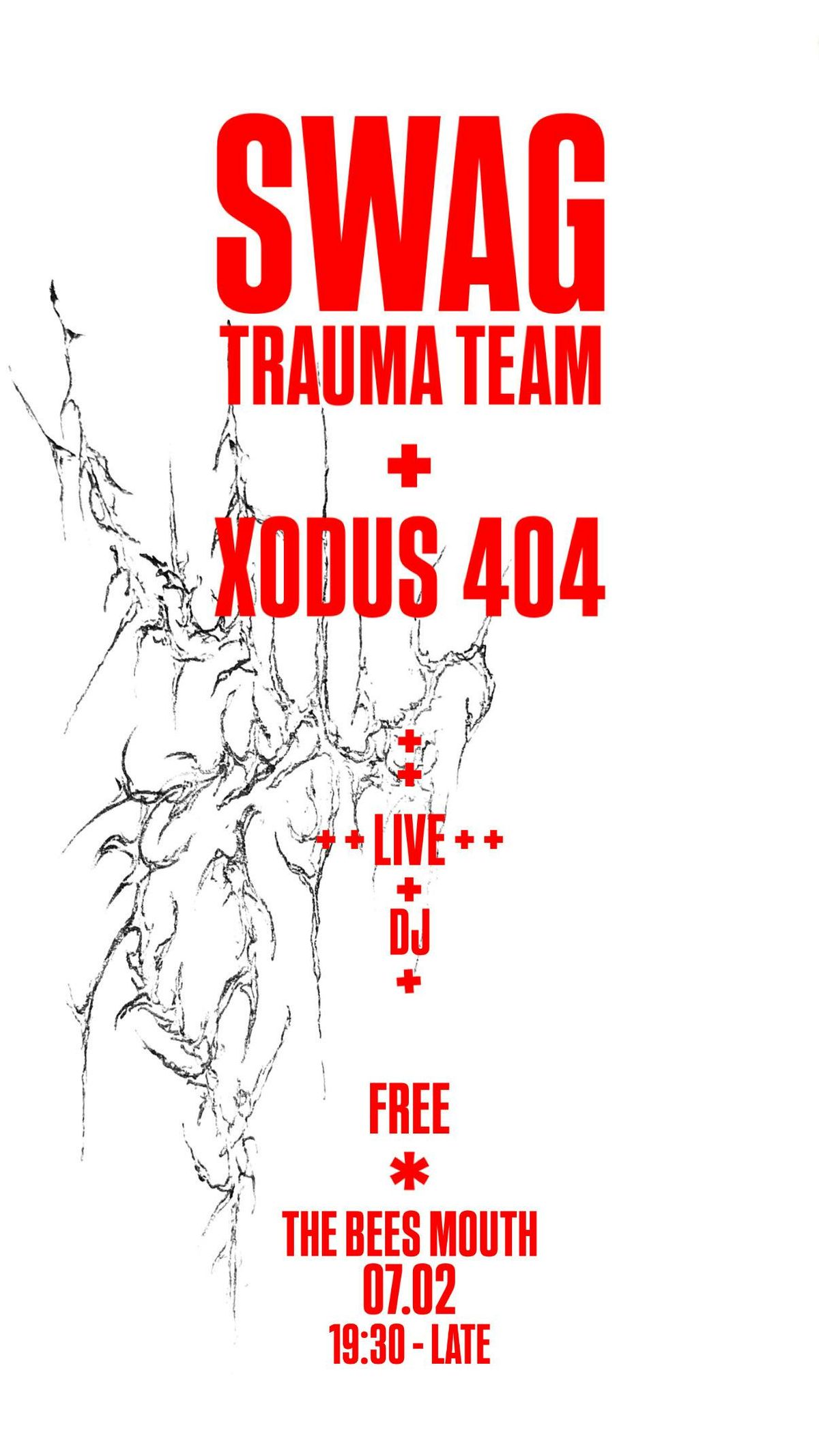 SWAG TRAUMA TEAM & XODUS 404 + surprise DJ at The Bee’s Mouth. Live and DJ til late. Disclaimer: