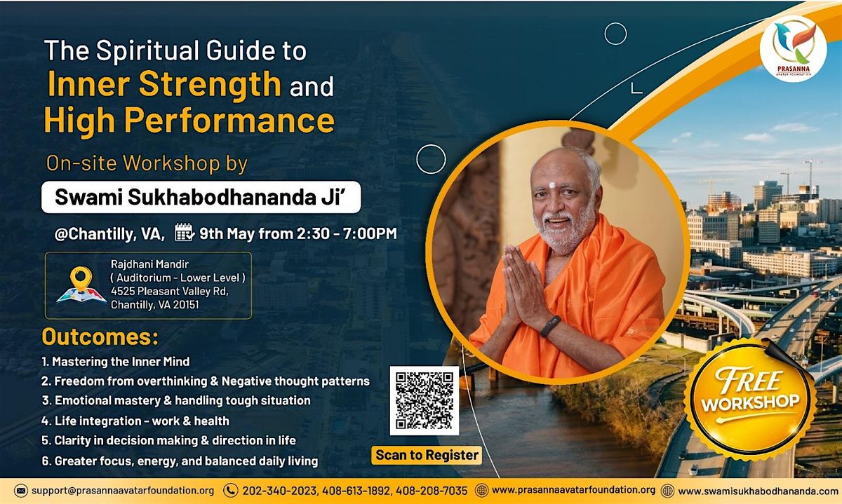 This on-site workshop, led by Swami Sukhabodhananda Ji, is designed to help individuals cultivate inner strength while enhancing personal and professional performance. Set in Chantilly, Virginia, the session blends spiritual wisdom with practical tools to address modern-day challenges such as stress, overthinking, and lack of clarity.