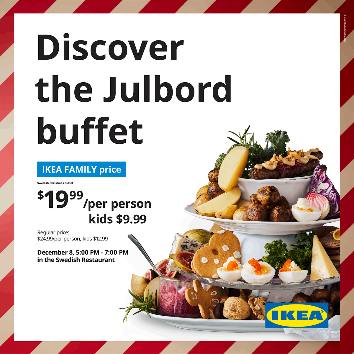 * Tickets are available for purchase in-store only. Tickets are subject to availability with limited tickets available to purchase on December8th. Julbord Buffet offerings may vary by store. Check your local IKEA Store Swedish Restaurant for hours and details. *