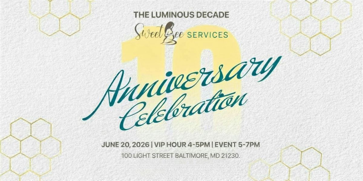Join us at 100 Light Street on June 20, 2026, at 4 PM (EST) to celebrate a decade of Sweet Bee Services! This milestone evening will bring together clients, families, partners, and supporters to honor Sweet Bee’s journey and invest in the future of birth work.