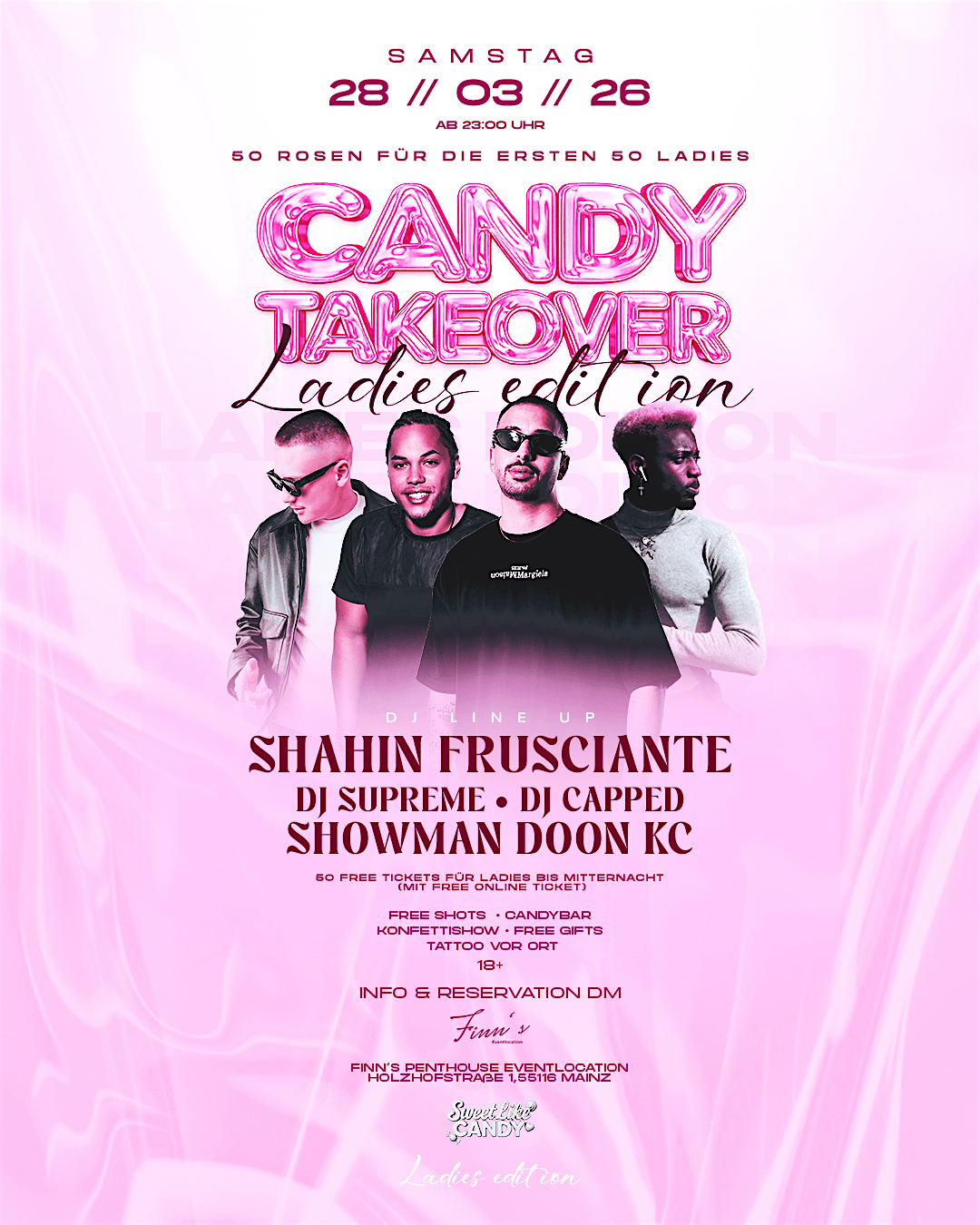 Am Samstag, 28.03.26 ab 23:00 Uhr verwandelt sich das Finn’s Penthouse Eventlocation, Mainz 🏙️ in ein pinkes Paradies voller Energie, Vibes & Special Moments nur für unsere Queens! 💕🔥