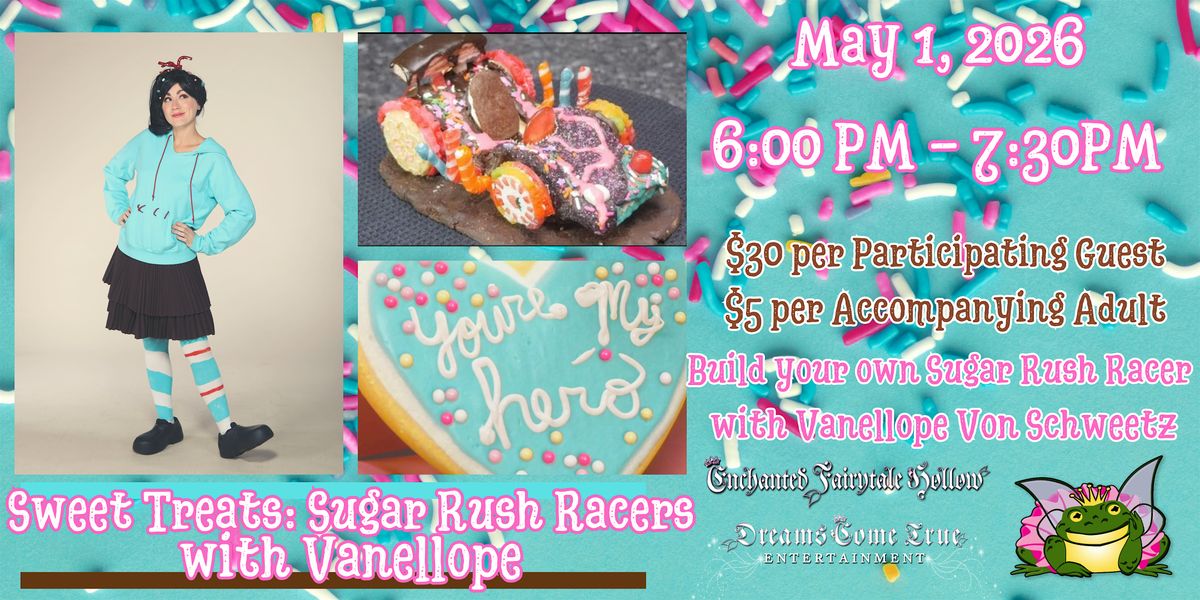 Come join us for candy coated fun and delightfully sweet treats with your favorite Sour Patch Kid, Vanellope Von Schweetz! Design, create & decorate your very own cookie race car, move and groove at a rockin' dance party and Meet and Greet with your favorite glitch.