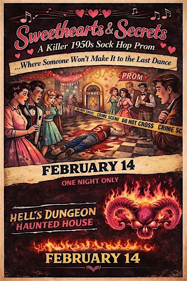 Step back into a 1950s sock hop like no other at SWEETHEARTS & SECRETS M**der MYSTERY DINNER at Hell’s Dungeon — Feb 14, 5–7:30.