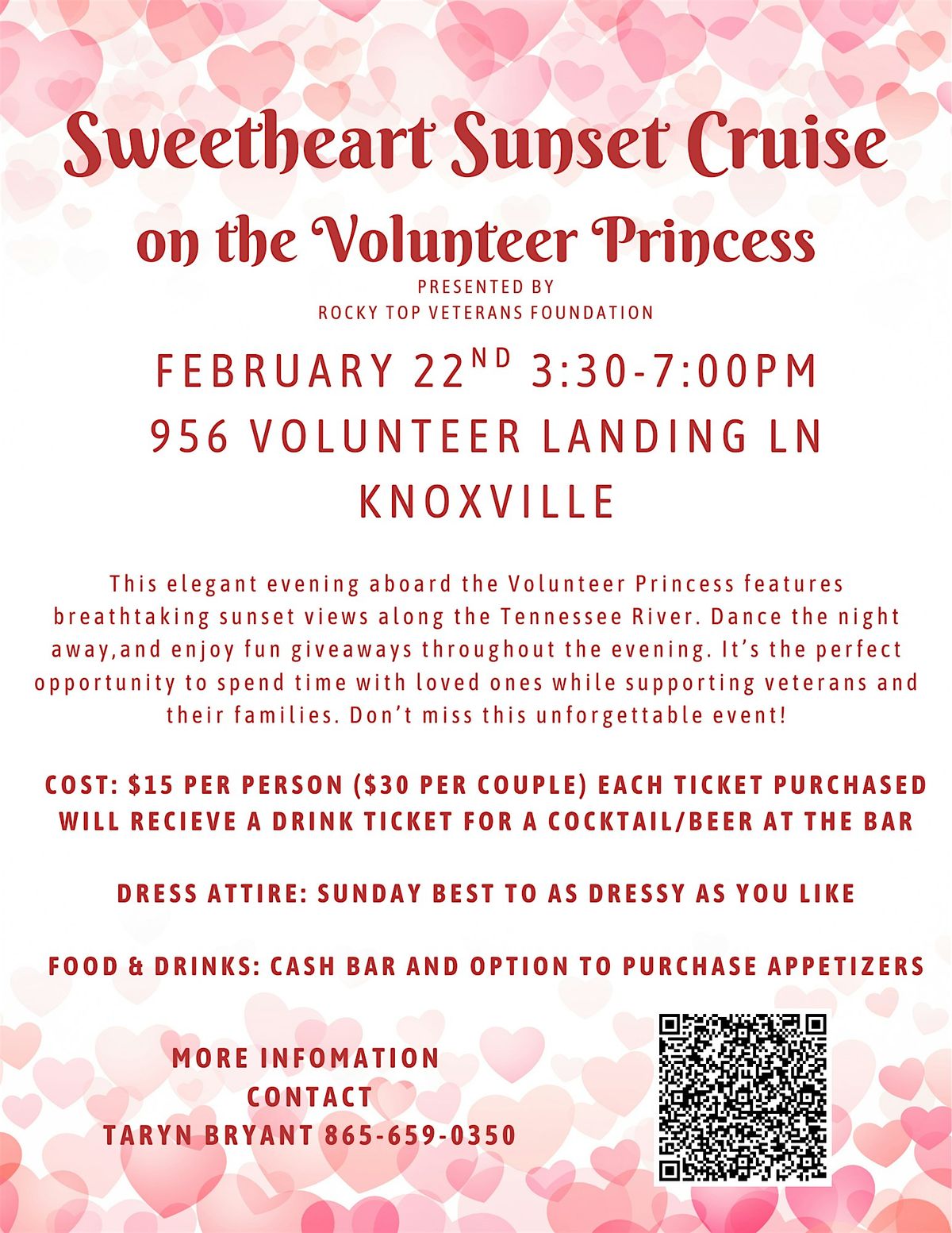 Celebrate love and friendship aboard the Sweetheart Sunset Cruise presented Rocky Top Veterans Foundation on February 22nd, 2025, from 3:30-7 PM. Yacht will leave PROMPTLY at 4pm. This elegant evening aboard the Volunteer Princess features breathtaking sunset views along the Tennessee River, a cash bar, and the option to purchase delicious appetizers. Dance the night away, and enjoy fun giveaways throughout the evening. It’s the perfect opportunity to spend time with loved ones while supporting veterans and their families. Don’t miss this unforgettable event!