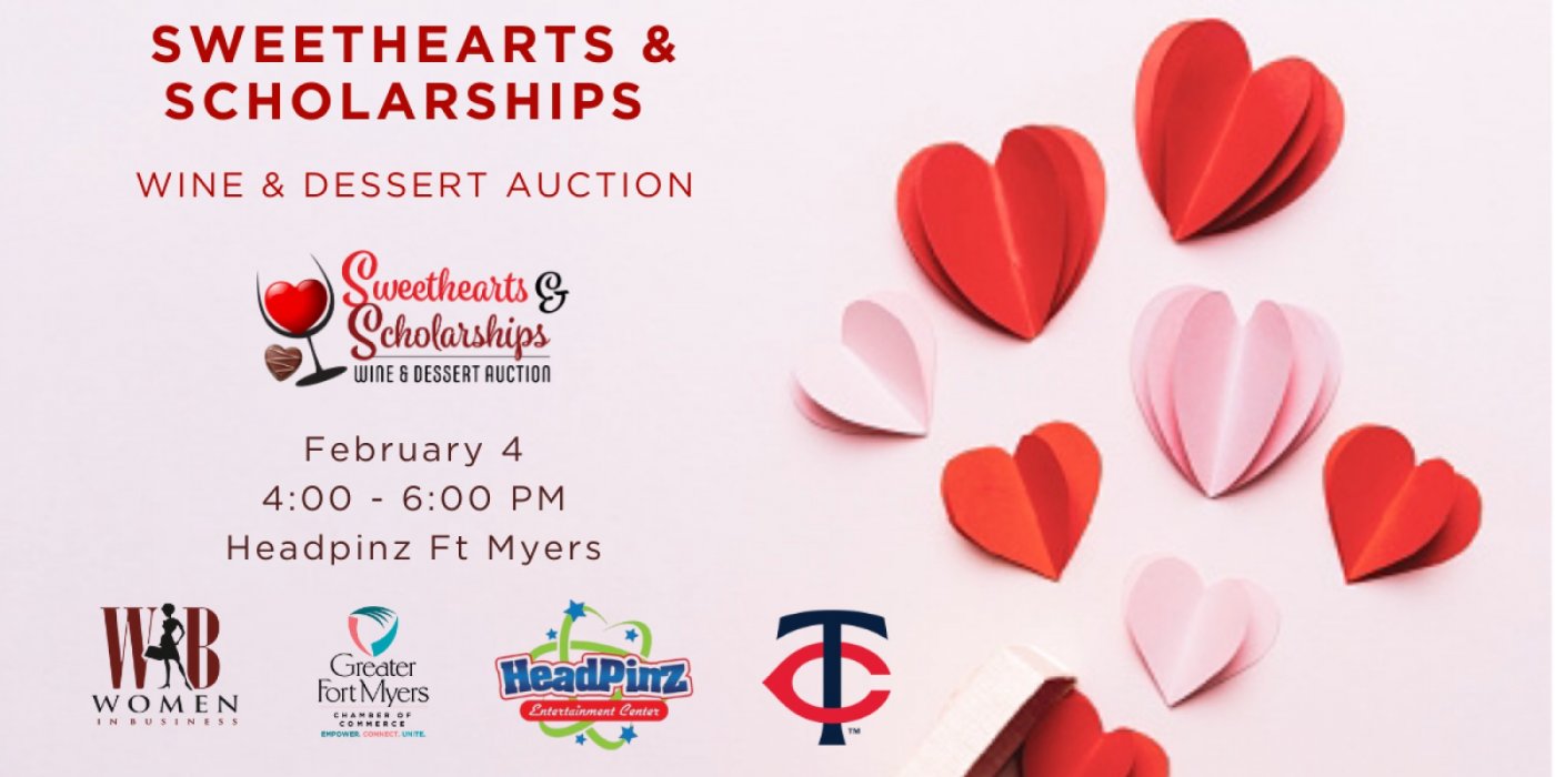 The Greater Fort Myers Chamber of Commerce’s Women in Business Committee invites the community to its Annual Sweethearts & Scholarships Wine & Dessert Auction on Wednesday, February 4, 2026, from 4:00 p.m. to 6:00 p.m. at HeadPinz Entertainment Center, located at 14513 Global Parkway, Fort Myers, FL 33913.