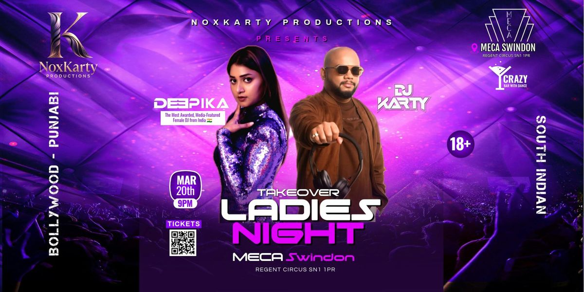 Bollywood & South Indian Ladies Night is finally back 🔥Prepare for a blockbuster night as DJ KARTY joins forces with International DJ Deepika, the Official DJ of Chennai Super Kings and the No.1 Female DJ in South India. From chart-topping Bollywood anthems to high-octane Punjabi and South Indian beats, her global sound and unmatched stage presence will keep the party at peak energy all night long. This is not just a party—it’s an experience.