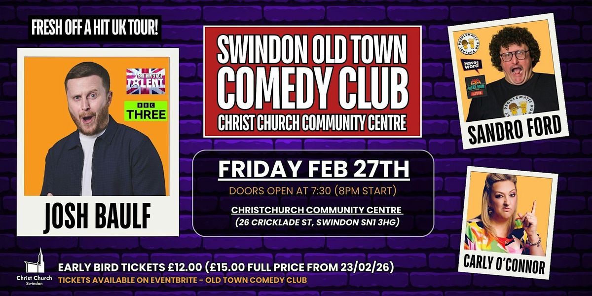 The Swindon Old Town Comedy Club Returns to the Christ Church Community Centre! Join us Friday Febuary 27th for another packed-out night of laughter with acts including star if Britain's Got Talent and Shortlisted BBC New Comedian of the Year, JOSH BAULF (Fresh off his UK Tour!) Problematic Pub Podcast Star SANDRO FORD (As seen on hit comedy podcasts such as Have a Word, Dead Men Talking, Hot Water Comedy Green Room) and up-and-coming star CARLY O'CONNOR!