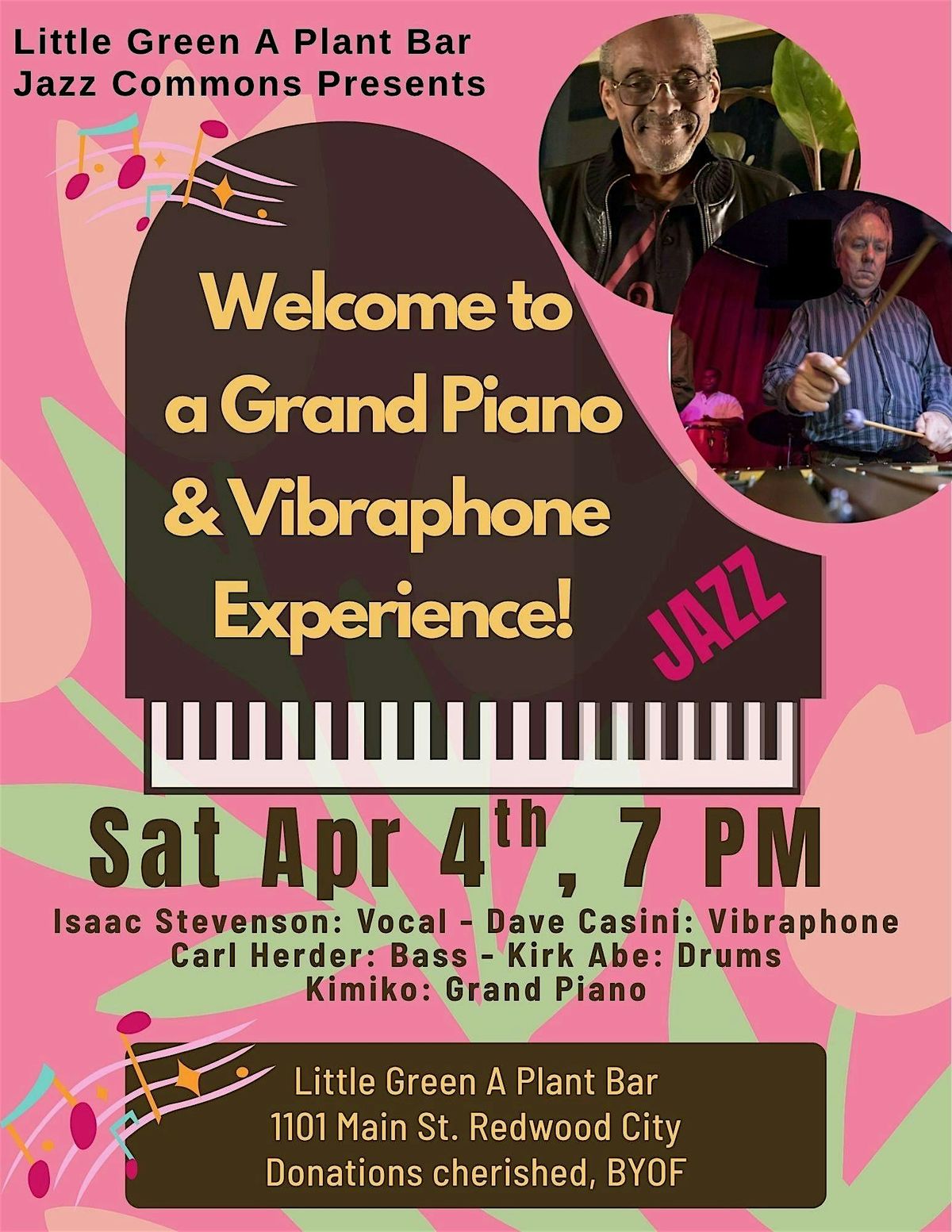 Kimiko and friends are back for their monthly residency as part of Little Green's Jazz Commons series! This is event is free to the public, with donations to the musicians cherished. This event marks the debut performance with Little Green's recently acquired Steinway grand piano, generously gifted by the local Boutacoff family. Dave Casini will be joining the ensemble on vibraphone, creating a magical sound for those listeners present.