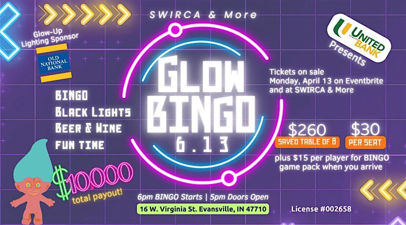 SWIRCA’s almost consistently sold-out Super BINGO event gets a GLOW-UP! We’ve turned down the lights and added black lights, pumped up music, and party vibes, so wear your white and fluorescent attire and accessories and come ready for some fun!