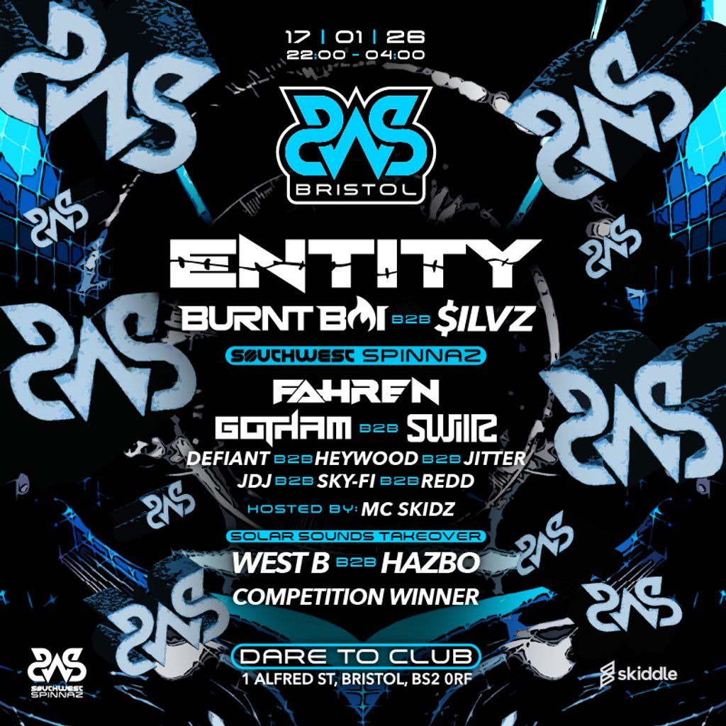 SWS BRISTOL: Southwest Spinnaz lands with a filthy debut lineup - Entity headlining with Burntboi & Silvz, plus a full SWS assault. 17.01.26Artists