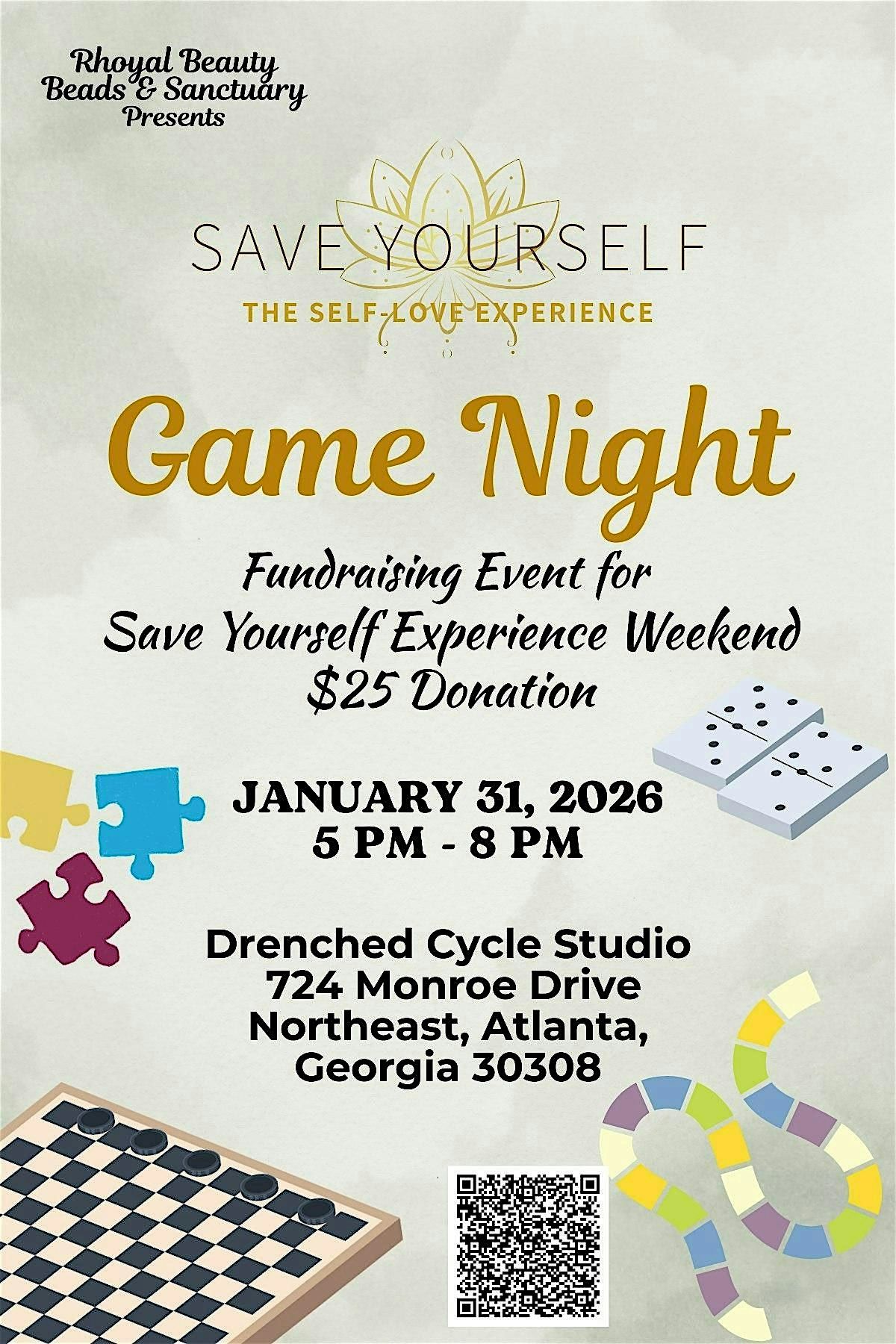 Join us for a fun-filled Game Night Fundraiser in support of Save Yourself – The Self Love Experience (SYE)! This night is all about community, laughter, and purpose while helping bring an impactful wellness experience to life.
