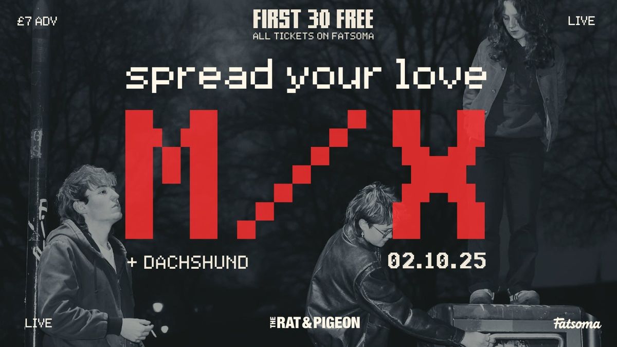 FIRST 30 FREE - SPREAD YOUR LOVE PRESENTS: M/XM/X is a young, three-piece punk rock powerhouse known for their raw energy and chaotic live shows. Hailing from Bristol, England, the band’s visceral sound draws comparisons to the likes of IDLES, Soft Play and Kid Kapichi, with trashy rhythms, angsty guitars and socially charged lyrics that hit like a punch in the gut. Their explosive performances have landed them spots at festivals like 2000 Trees and Dot To Dot, as well as stages at iconic Bristol venues like Thekla and The Louisiana.DACHSHUND supportFIRST 30 TICKETS ARE FREE!Spread it x