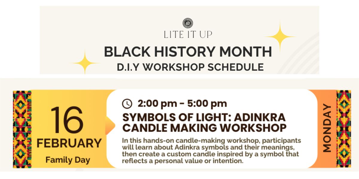 Get ready to ignite your creativity at the Symbols of Light workshop! Join us in person for a fun, hands-on experience where you'll learn to make your own beautiful Adinkra candles. Discover the rich meanings behind these traditional symbols while crafting unique candles that brighten up your space. Perfect for anyone who loves art, culture, and a bit of DIY magic. Don’t miss out on this glowing opportunity to create and connect!