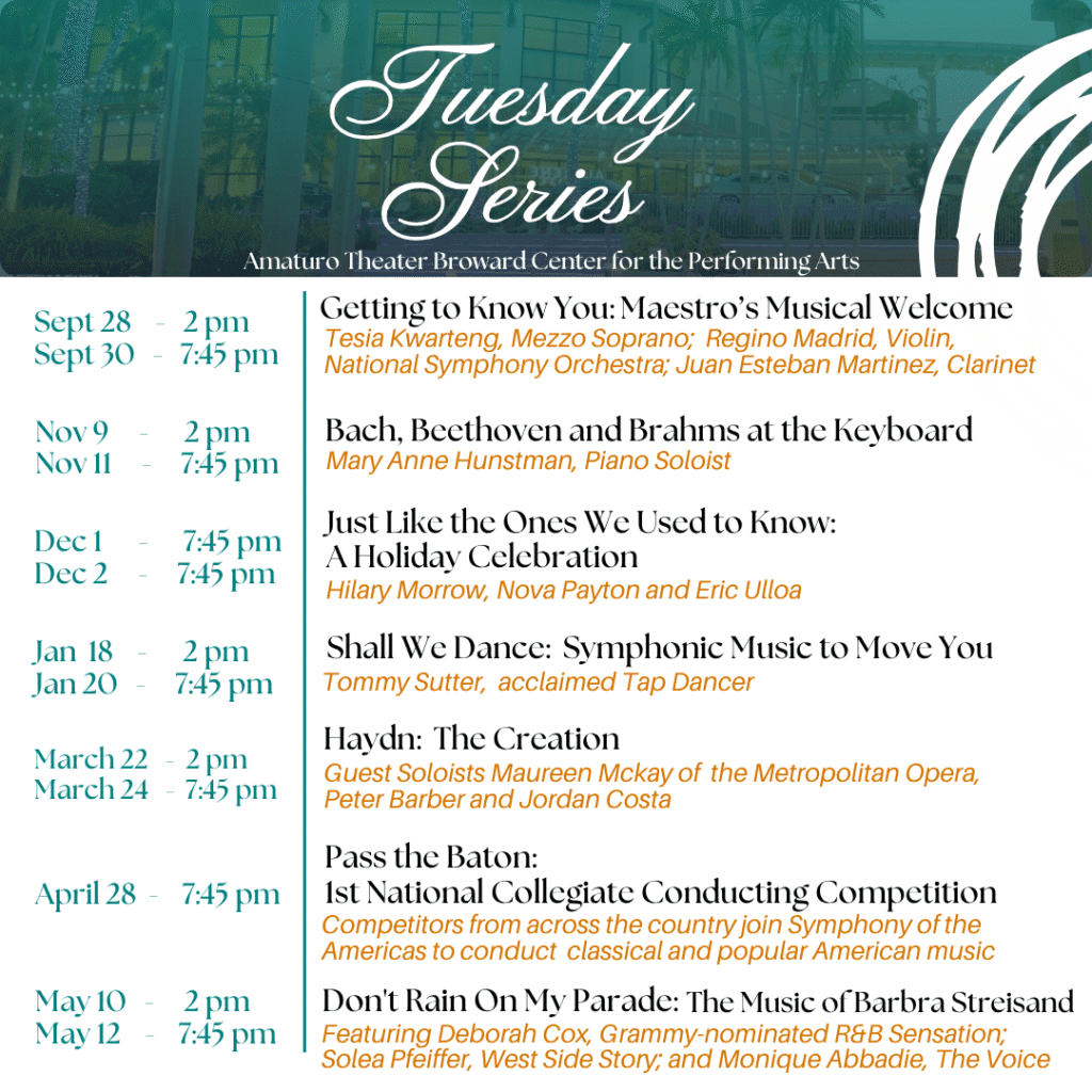 π Welcome to Symphony of the Americas - Dont Rain on my Parade at Broward Center Amaturo, where the impossible becomes possible and dreams take flight! ποΈ Join us at Broward Center Amaturo in the heart of Fort Lauderdale, FL for an event that will redefine your expectations. π On May 10th, 2026 at 02:00 PM, witness the transformation of space and time into something truly magical. β¨ It's a curated experience combining the best of innovation, entertainment, and community spirit, creating moments that will be remembered for years to come. Whether you're a first-time visitor or a seasoned enthusiast, prepare to be amazed. π Book now to ensure your place in this unforgettable experience!