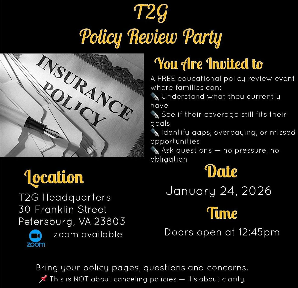 You are invited to the T2G Policy Review Party, a FREE educational event created to help individuals and families gain clarity around their existing life insurance policies β regardless of the company youβre currently with.