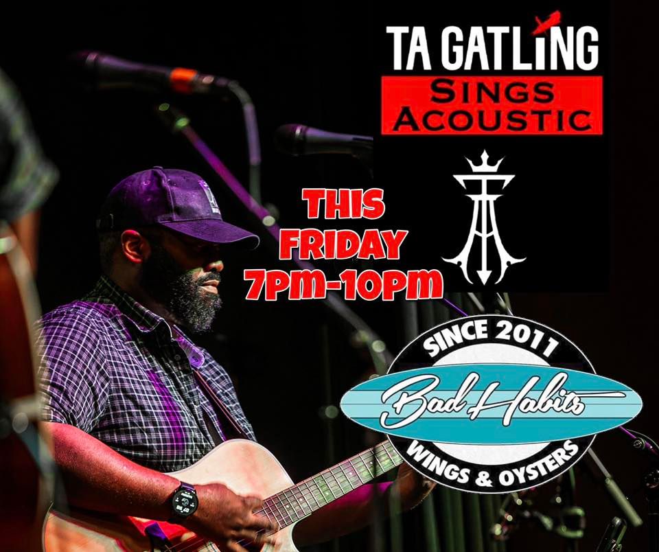 TA Gatling is performing soulful rock originals and top40’s acoustic music LIVE at BAD HABITS WING & OYSTER BAR in CHESAPEAKE!Come out, eat Great food, have great beverages, and have a fun time????