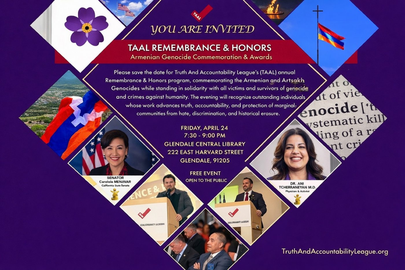 Truth And Accountability League (TAAL) will commemorate the 111th anniversary of the Armenian Genocide on April 24 in Glendale, honoring the memory of 1.5 million victims and recognizing distinguished leaders for their contributions to advancing human rights and combating discrimination.