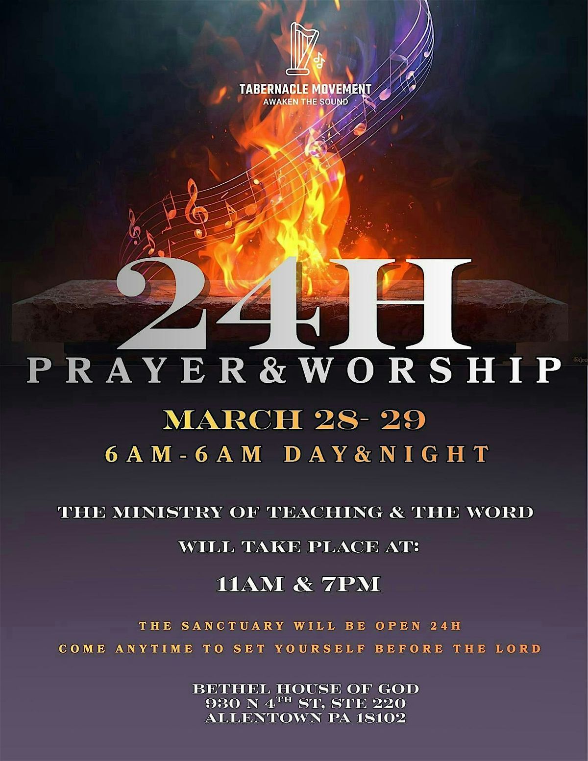 On March 28–29, we will gather for a 24-hour watch of prayer and worship (6:00 AM – 6:00 AM) day and night, unto the Lord. The sanctuary will remain open for all who desire to come and dwell, pray, worship, and stand before Him.