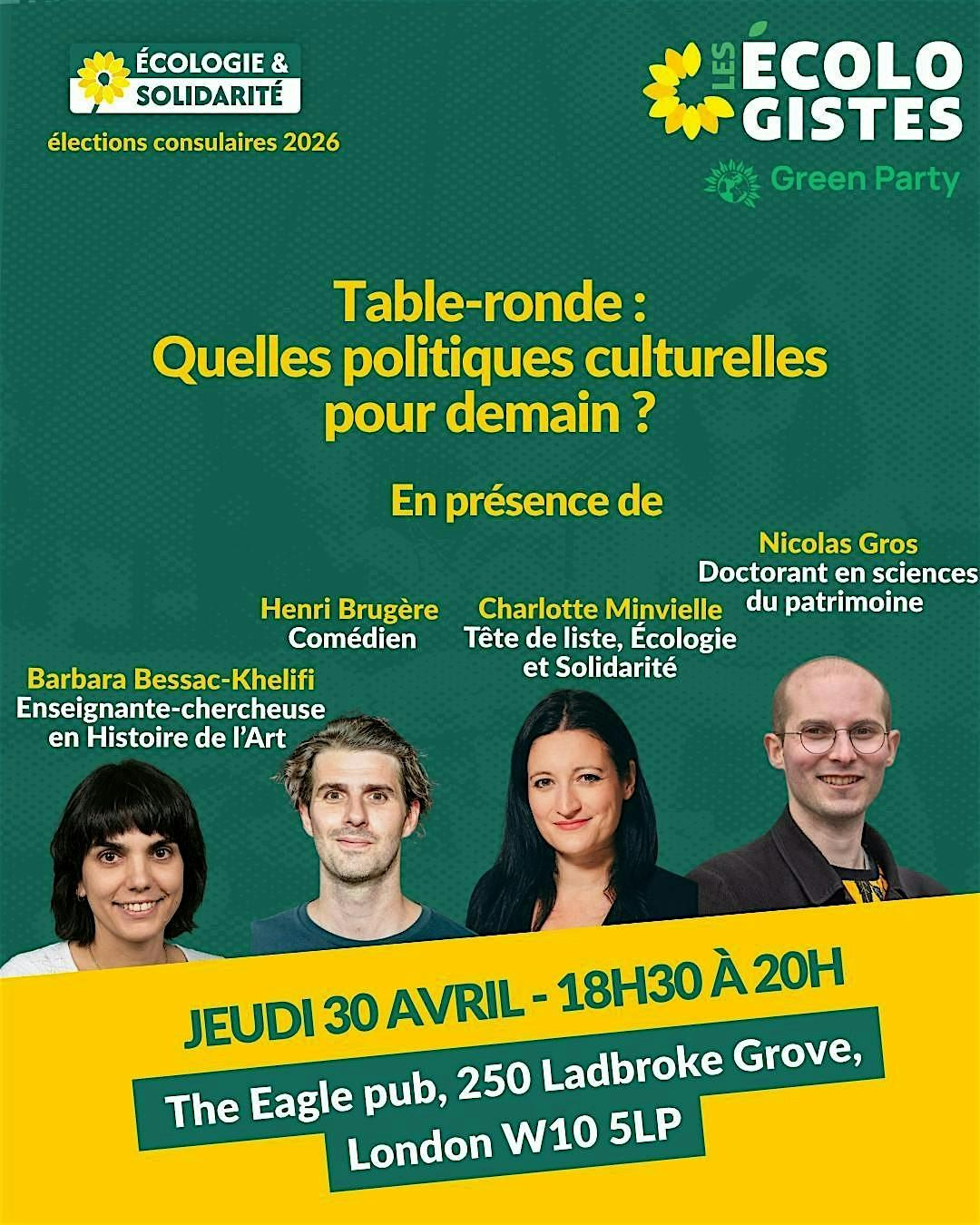 À l'occasion des élections consulaires 2026, les Écologistes organisent une table ronde pour discuter de la culture et des politiques culturelles entre la France et le Royaume-Uni.