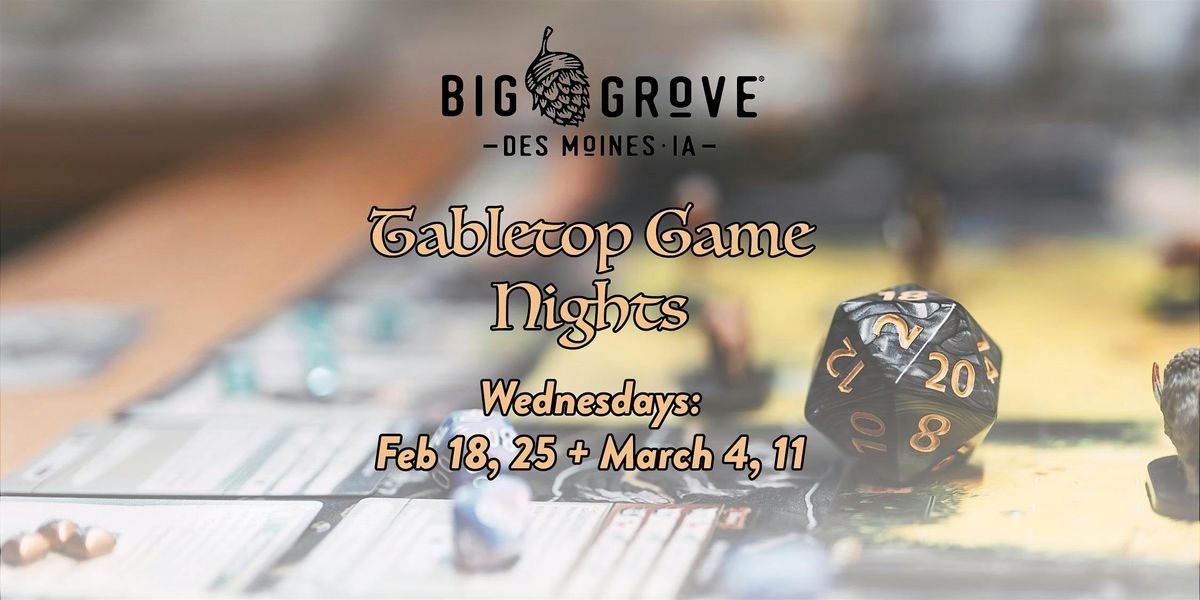 Join us at Big Grove for an open tabletop game night! Grab a seat, order a beer, and jump into the fun. We’ll have a mix of crowd-favorite games like Settlers of Catan, Betrayal at House on the Hill, and more, or feel free to bring your own games to share with the table.