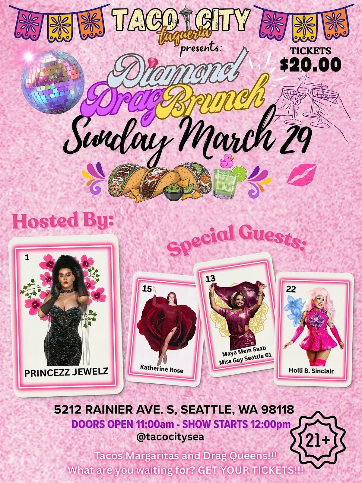 Get ready for a fabulous afternoon of glam, flavor, and fierce performances at Taco City! Join us on March 29 for an unforgettable Drag Brunch hosted by the sensational Princezz Jewelz.