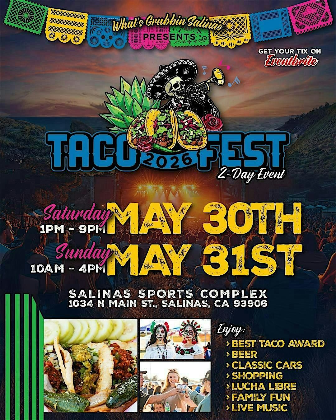 Taco Fest 2026 takes over the Salinas Sports Complex for a 2-day celebration of tacos, mariscos, micheladas, music, culture, and community! Enjoy food vendors, live music, lucha libre on Saturday, classic & lowrider car showcase on Sunday, desserts, retail vendors, and family-friendly activities all weekend long. This is the ultimate Central Coast food festival for taco lovers, culture enthusiasts, and families. Come hungry and get ready for two unforgettable days of food, flavor, and festival vibes!