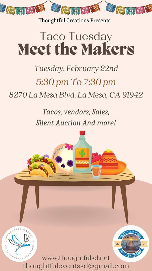 Come join us on Tuesday the 22nd from 5:30-7:30 for a Taco Tuesday Meet the Maker event.We will have Tacos, Drinks, Silent Auctions, Sales & more!