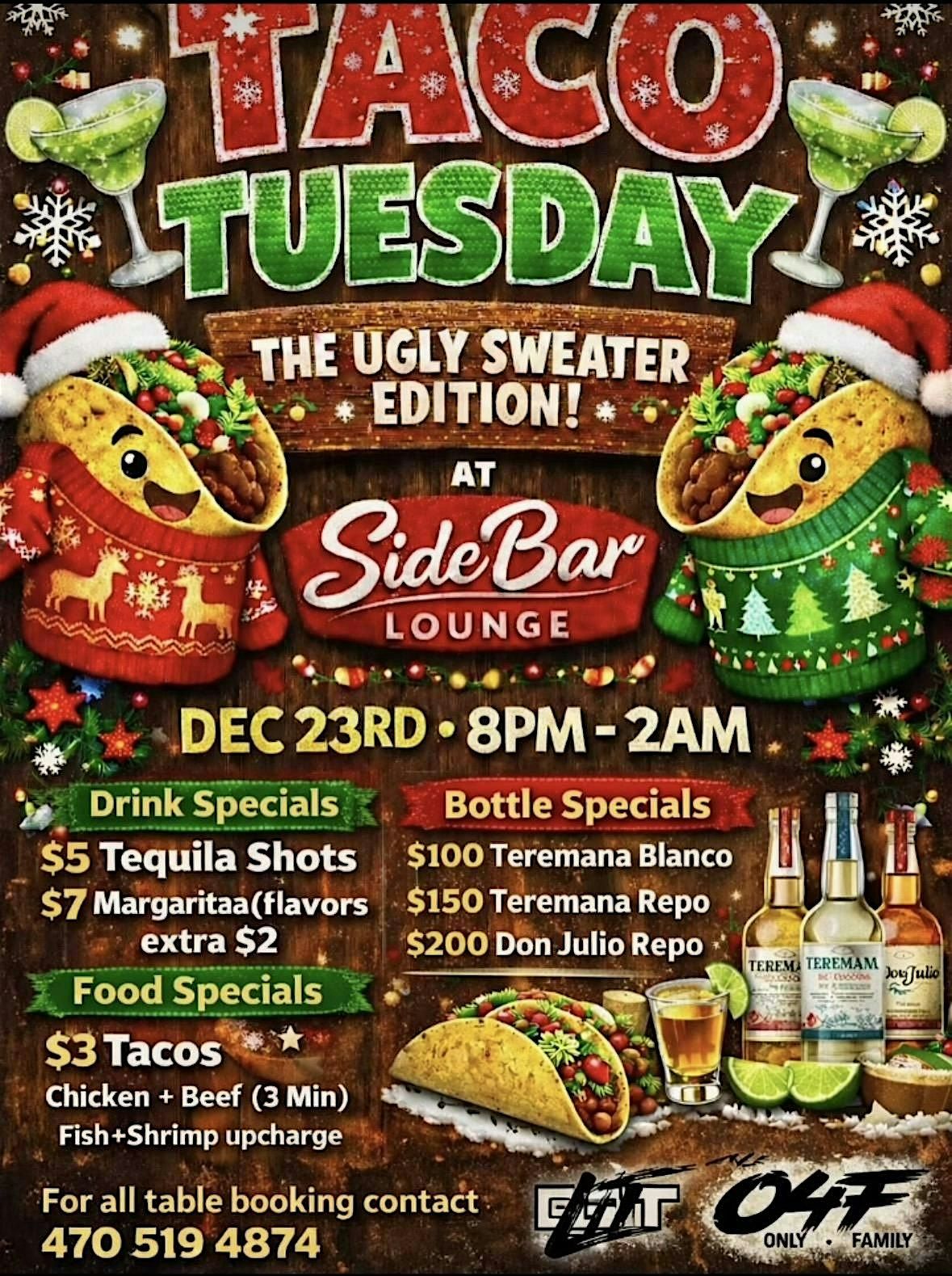 #TacoTuesday #UglySweaterParty #SideBarLounge #AtlantaNights #TacosAndTequila #HolidayVibes #EatDrinkParty