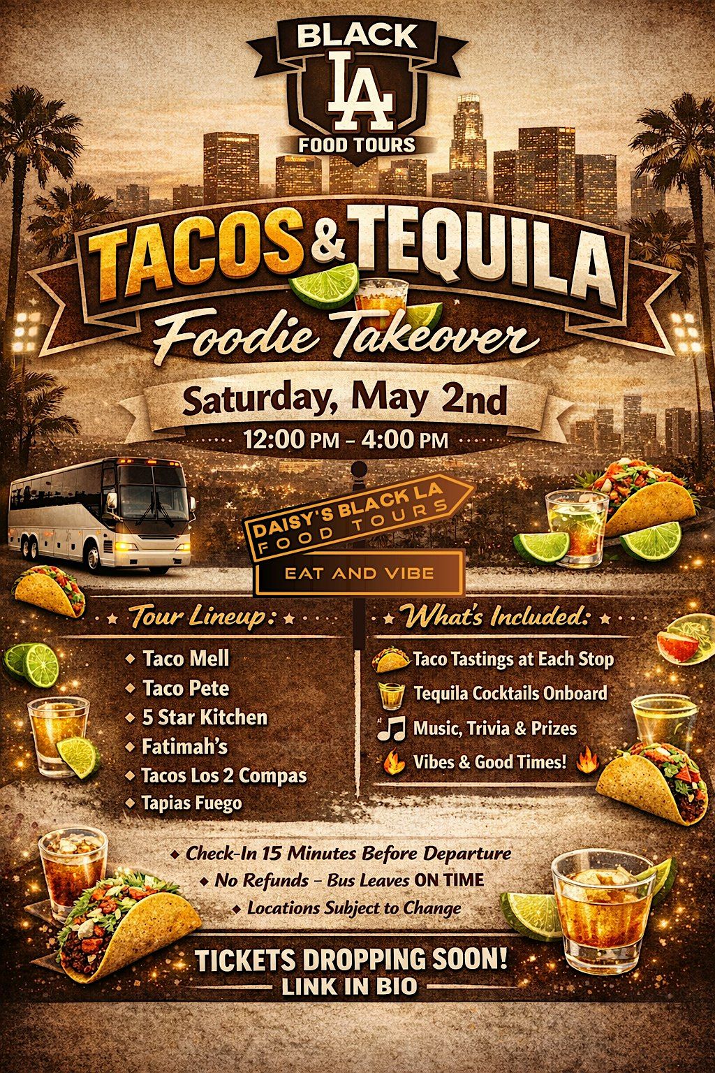 Ride and vibe with your favorite foodies on the Tacos & Tequila Foodie Takeover 🌮🍹 Hop on our luxury party bus as we travel to some of the best taco spots across Los Angeles and surrounding cities. This experience features Taco Mell, Taco Pete, 5 Star Kitchen, Fatimah’s, Tacos Los 2 Compas and Tapias Fuego. Enjoy curated taco tastings at each stop, tequila cocktails onboard, music, trivia, prizes and hella vibes all ride long.