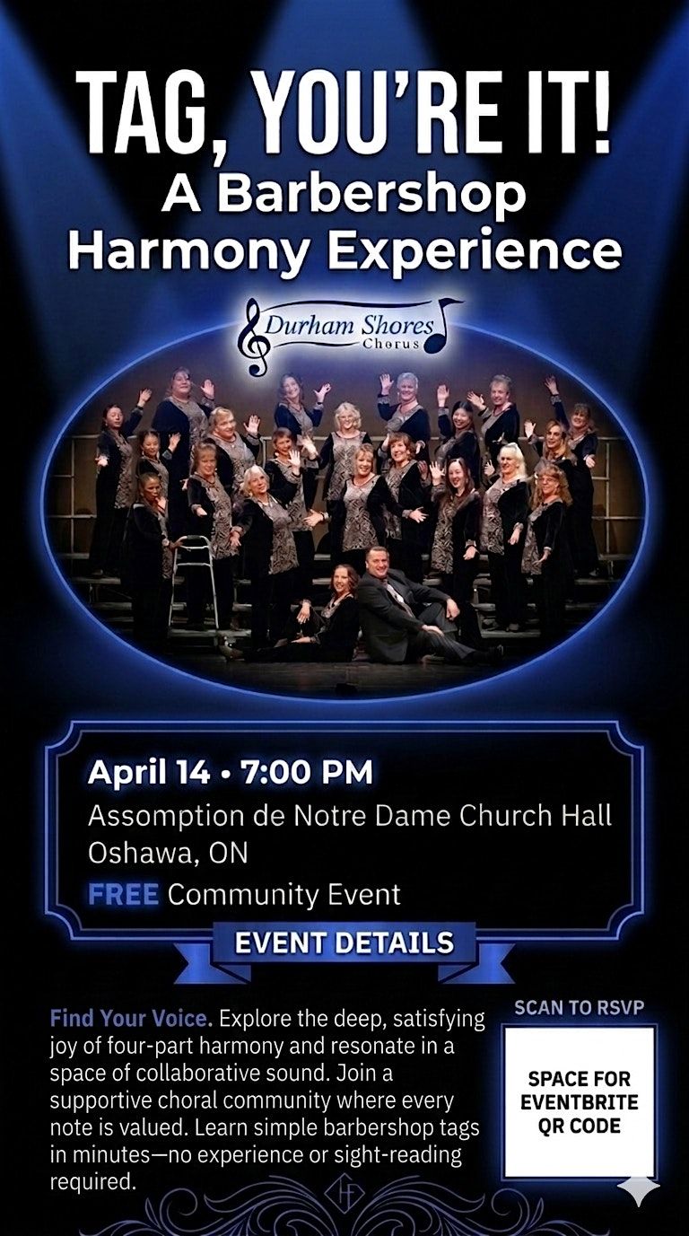Durham Shores Chorus invites you to a unique, interactive musical evening where you won’t just listen—you’ll sing, learn, laugh, and discover what makes barbershop harmony so magical. Where voices unite to make harmony and chords come alive. Try singing a “tag” with us and feel the thrill of ringing chords in four‑part harmony. This two‑hour event blends our performance with hands‑on learning, making it perfect for singers and non‑singers alike.