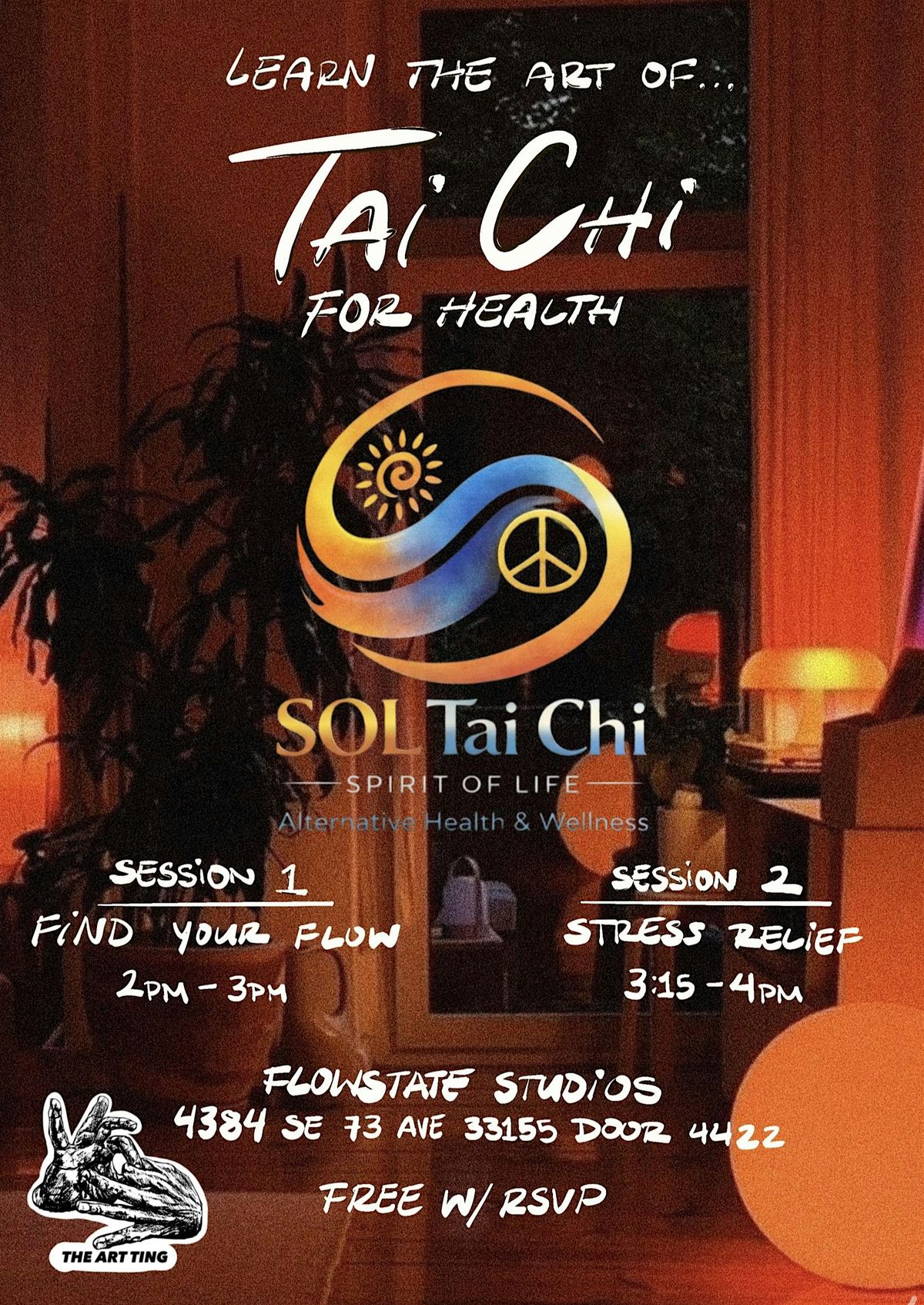 Come out to The Art Ting to enjoy a relaxing day of Tai Chi with Sol Tai Chi. The first session, "Find Your Flow" focuses on learning the basics of movement with Tai Chi. The second, "Stress Relief" exposes you different tequniques to release that tension. Dress in your favorite loose attire and enjoy the movement.