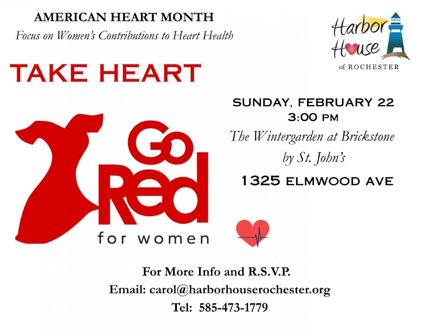 Please help to build awareness, make an impact, and save more lives by joining us for this eventful meeting of the minds! Take Heart and Go Red on Sunday February 22, 3-5 pm at the Wintergarden at Brickstone by John's, 1325 Elmwood Avenue in Rochester!