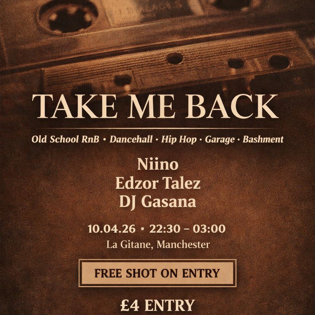 Take Me Back - a nostalgic night of old school R&B, hip hop, dancehall, garage & bashment. Free shot on entry. Manchester vibes.Music Genres : UK Garage, R&B, Dancehall, Rap, Jungle