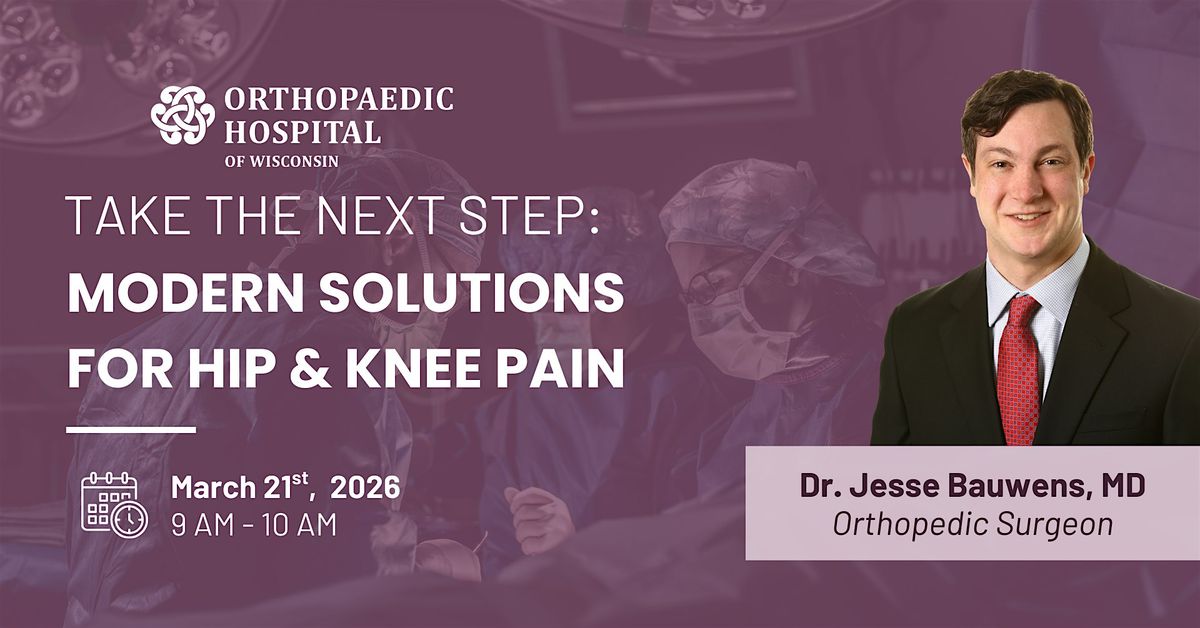 Join us on Saturday, March 21, for a free community seminar led by Orthopaedic Hospital of Wisconsin (OHOW) surgeon Dr. Jesse Bauwens, on anterior hip replacement and robotic-assisted knee replacement.