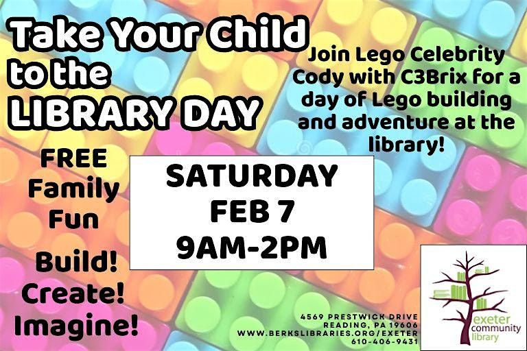Join us for Take Your Child to the Library Day at the Exeter Community Library on Saturday, February 7th, from 9AM-2PM. Cody Wells is a Lego artist and builder with C3Brix whose work has been featured across the country, including on The Steve Harvey Show and in national press. He creates unique Lego art, leads fun building activities and challenges, and inspires creativity. This is a FREE, all ages event (but recommended ages 4+) and will consist of a morning session (9AM-12PM) and an afternoon session (12:30PM-2PM). Stop by the Exeter Community Library and enjoy a fun day of games, prizes, and family fun!
