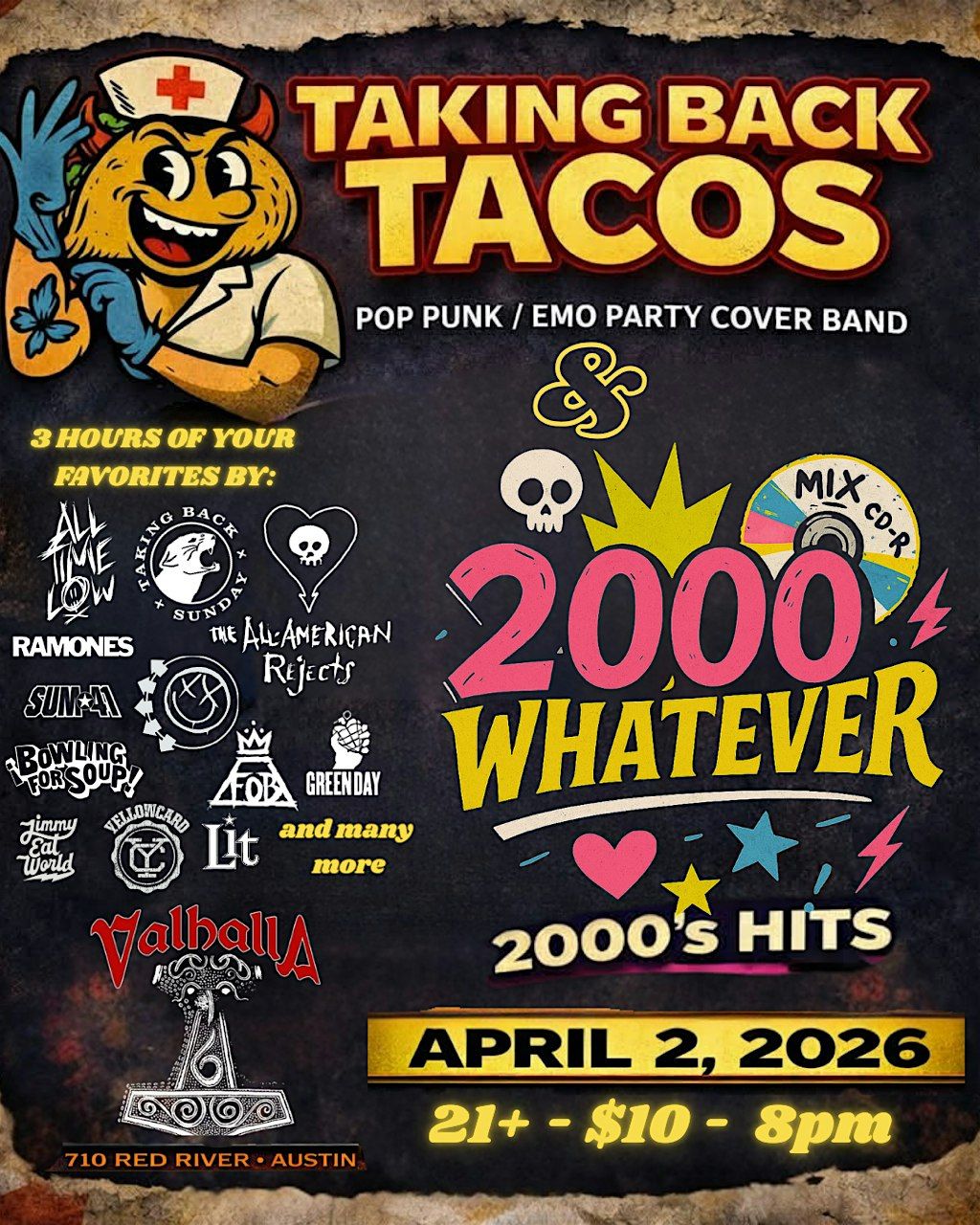 Taking Back Tacos Pop Punk Emo Cover Band & 2000 Whatever - 2000's Hits @ Valhalla 4/2. 3 Hours of your favorite singalong songs for $10