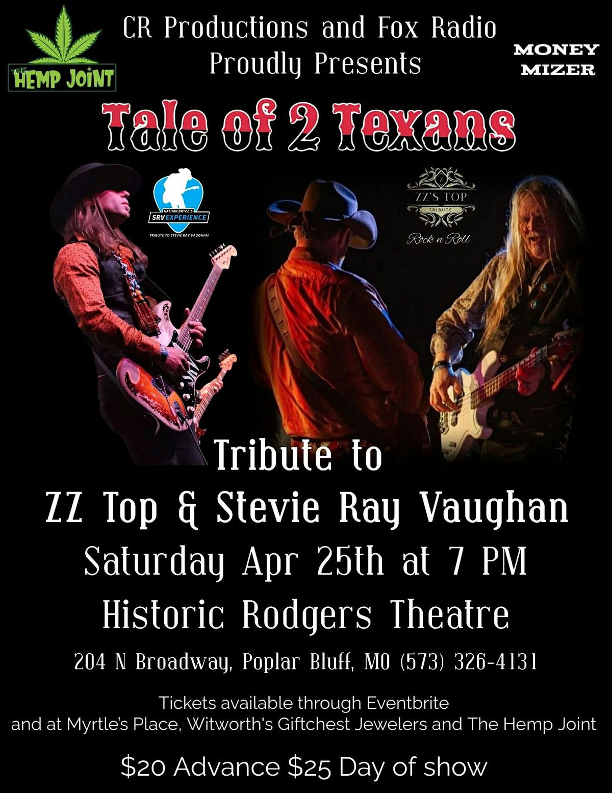 A Tale of 2 Texans is a tribute to the late great Stevie Ray Vaughn and the amazing music of ZZ Top. Come enjoy a high energy upbeat evening of great music and entertainment at the Historic Rodgers Theatre in Downtown Poplar Bluff, MO.
