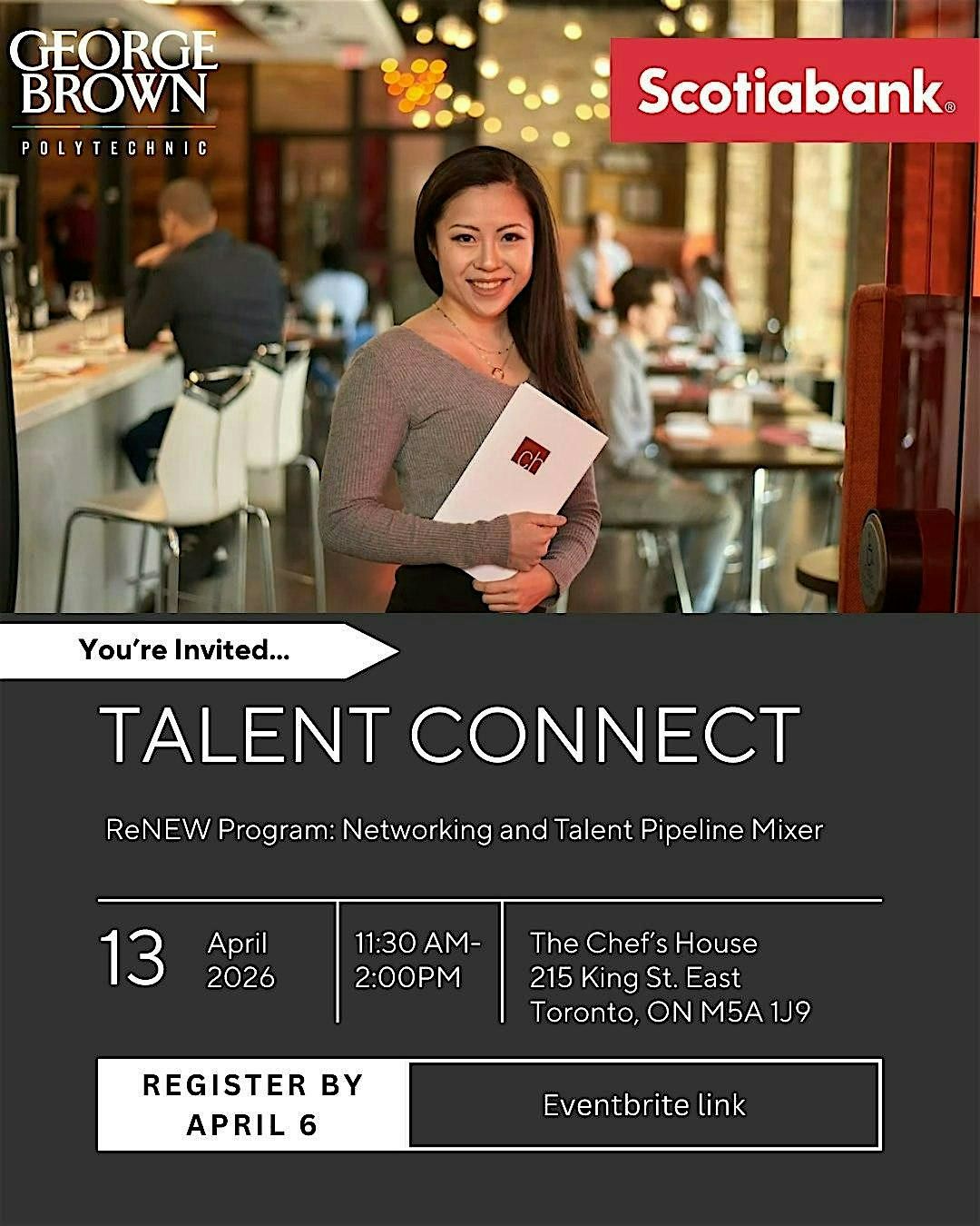 The event takes place at George Brown’s Chef’s House, the only student-run, fine dining restaurant in downtown Toronto. This is a networking reception, and canapes and non-alcoholic beverages will be served. We will have remarks from George Brown’s leadership, partners, and program graduates, and dedicated networking time.